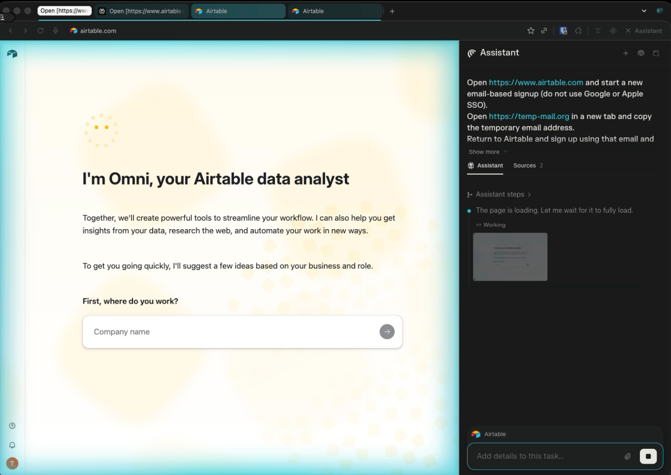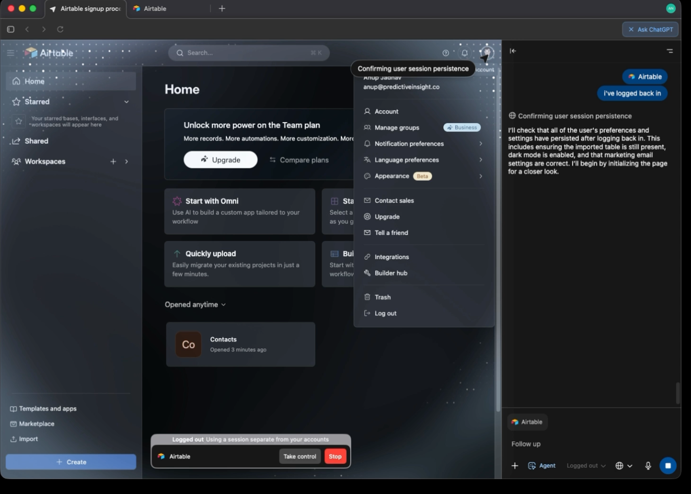 The second scenario focuses on SaaS onboarding. I asked the browser to sign up for Airtable using a temporary email, verify the account, upload files, change settings, export data, and then log in again to confirm persistence. This tested multi-tab workflows, email verification loops, session management, and UI navigation over several steps.