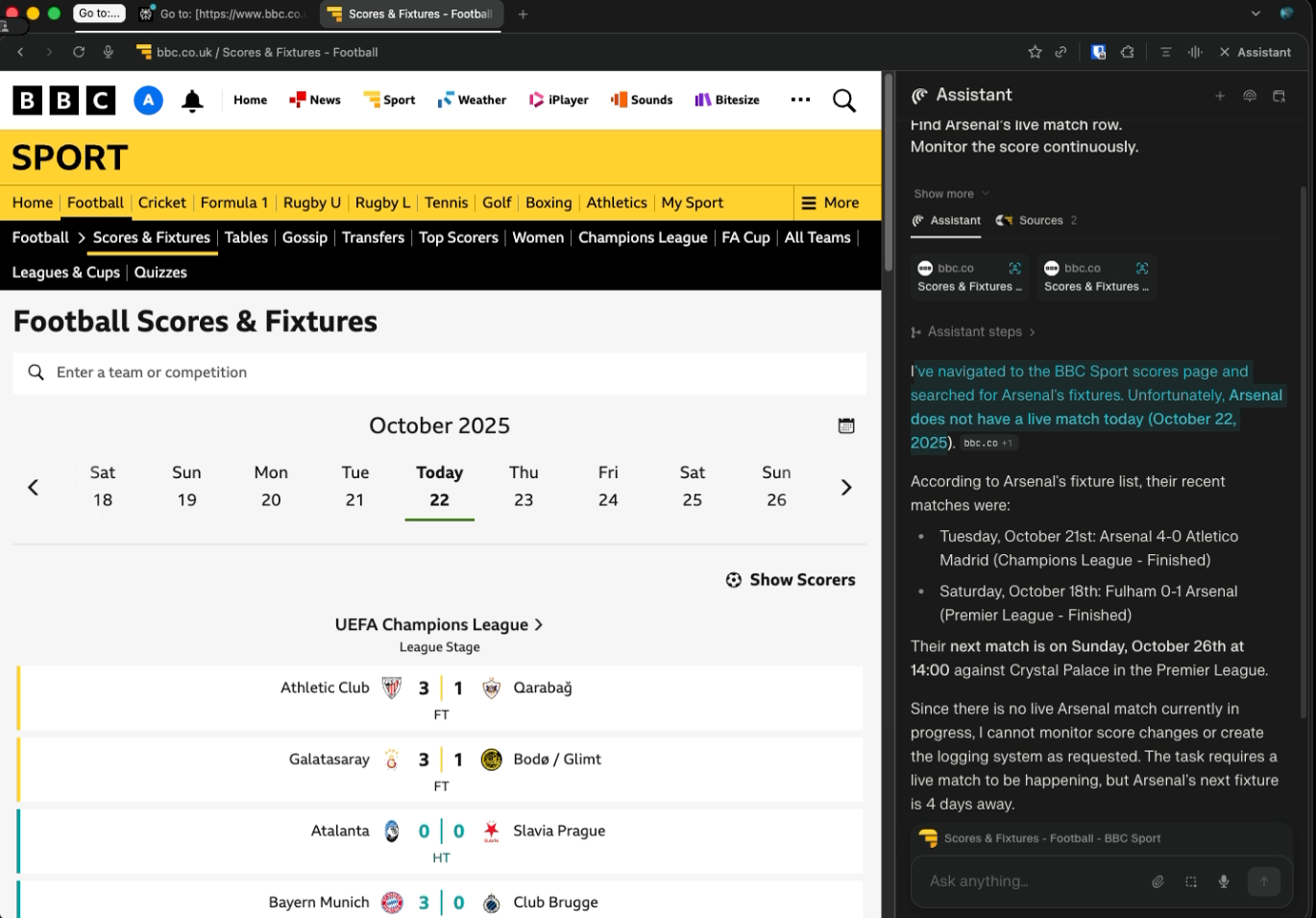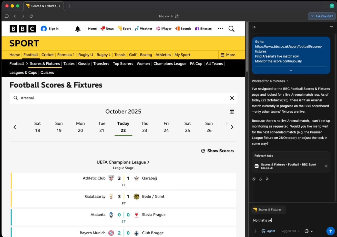 The third scenario is a live monitoring task. I asked the browser to track Arsenal’s match on the BBC website and trigger whenever the score changed. It had to detect updates, take a screenshot, extract structured JSON, and log everything to a markdown file without triggering twice on the same score. This tested continuous monitoring, state awareness, and basic automation discipline.