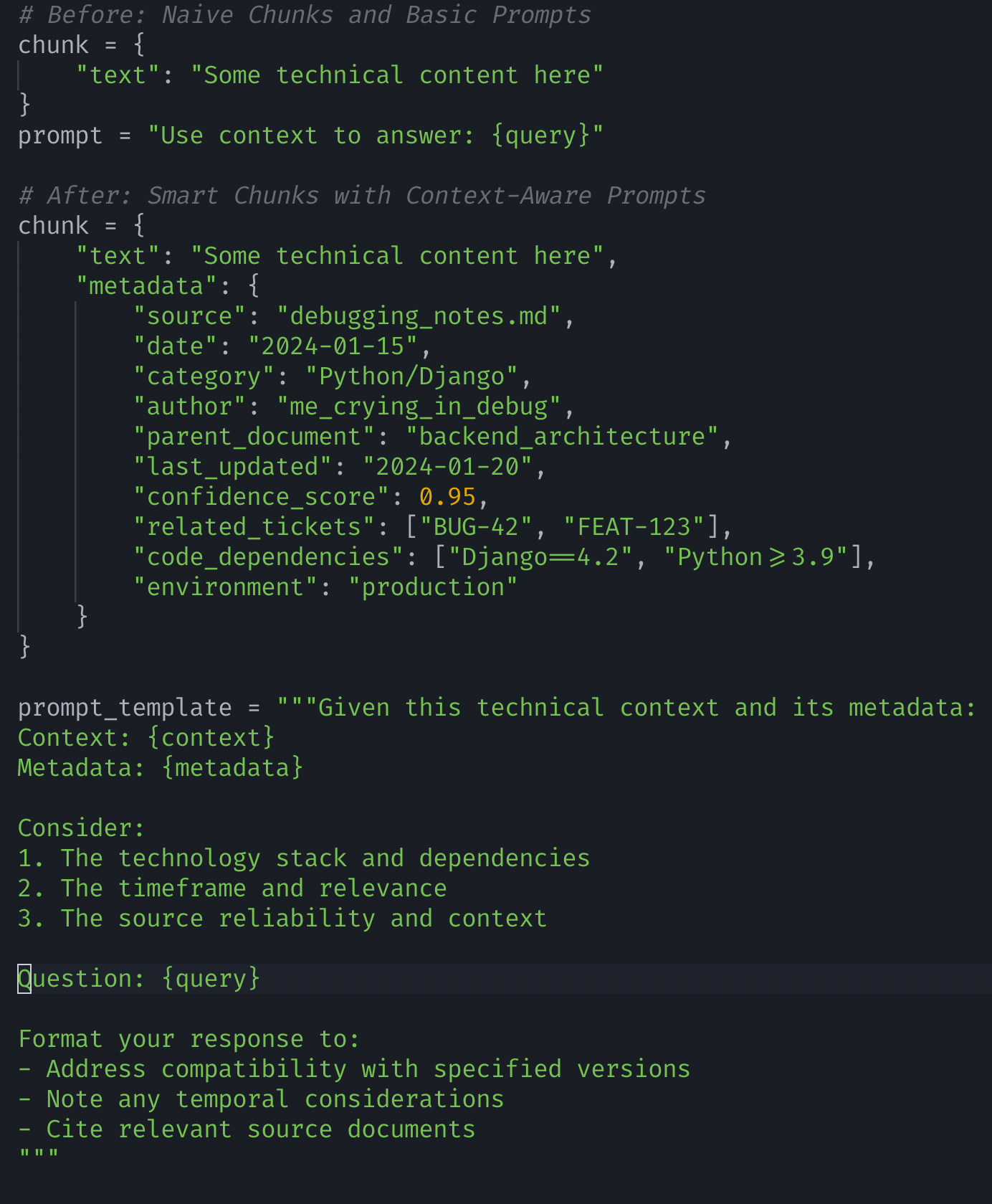 Remember those old library cards that told you not just the book's title, but also its location, subject, and checkout history? That's what good chunk metadata does for your RAG system. But metadata alone isn't enough - your prompts need to know how to use it effectively:
