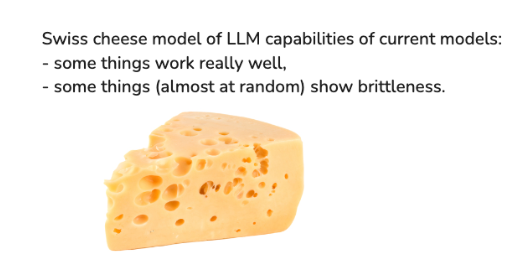 - Brittleness in certain use cases (Swiss cheese model of capabilities).