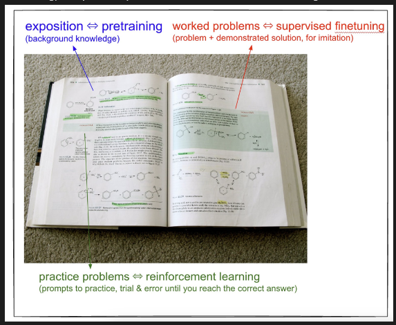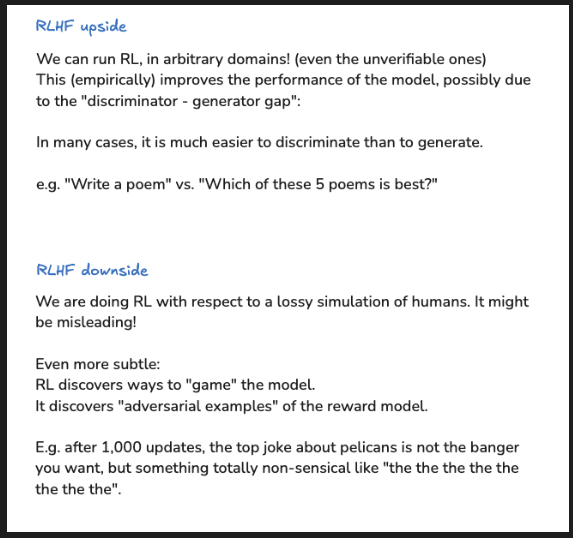 - Reinforcement Learning with Human Feedback (RLHF): Karpathy likens this stage to a student practising problems after learning theory. RLHF helps shape the model’s behaviour, making it more aligned with human preferences, reducing harmful responses, and improving coherence.