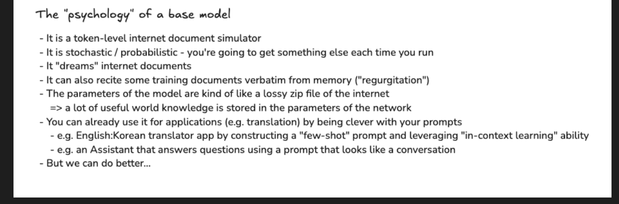 Karpathy dives into prompt engineering, explaining how well-structured prompts can drastically improve model outputs. He also discusses in-context learning, where LLMs learn from the structure of prompts without needing weight adjustments—making them highly adaptable.