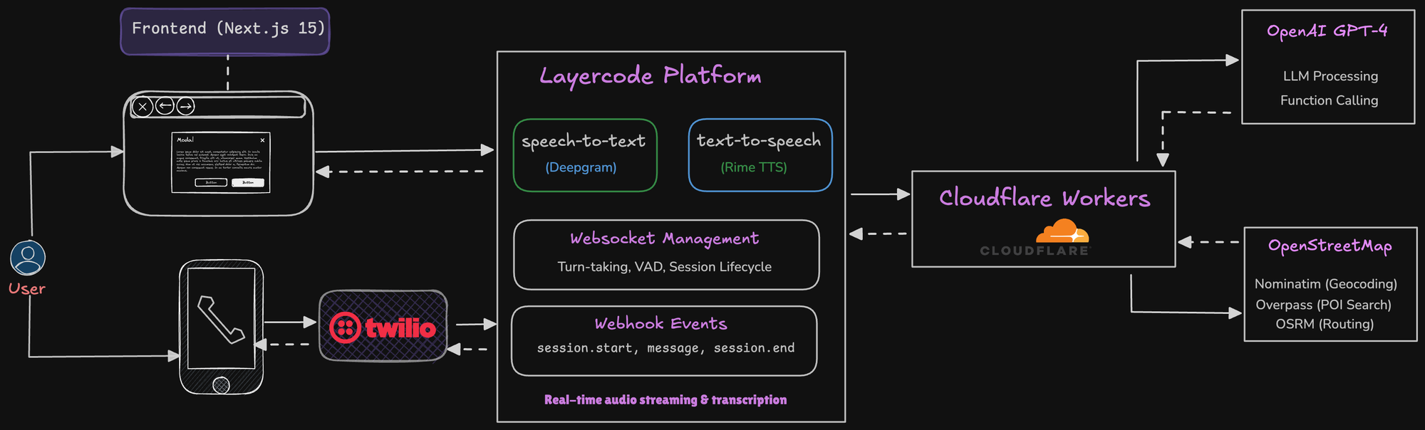 - Voice Processing: Layercode handles the heavy lifting here. They abstract away Deepgram for speech-to-text and Rime for text-to-speech. This means I didn't need to wire up multiple APIs myself.