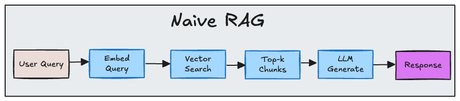 At its core, naive RAG is a four-step loop. Embed the query. Run similarity search. Take the top chunks. Send them directly to the model. It's straightforward, but brittle.