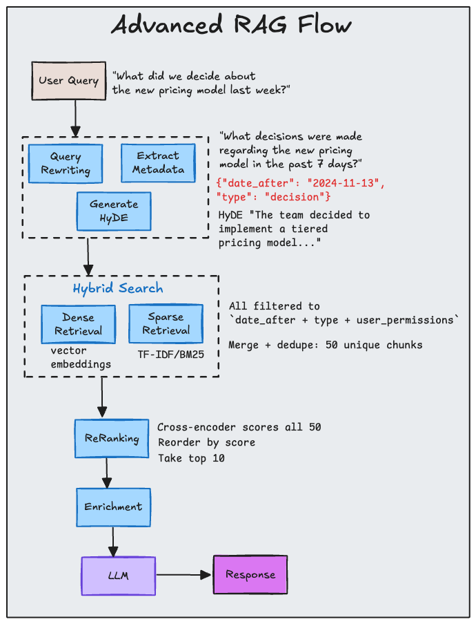 Advanced RAG strengthens retrieval before the model generates anything. It doesn't rely on a single vector search call. It layers techniques that compensate for the structural weaknesses in naive RAG.