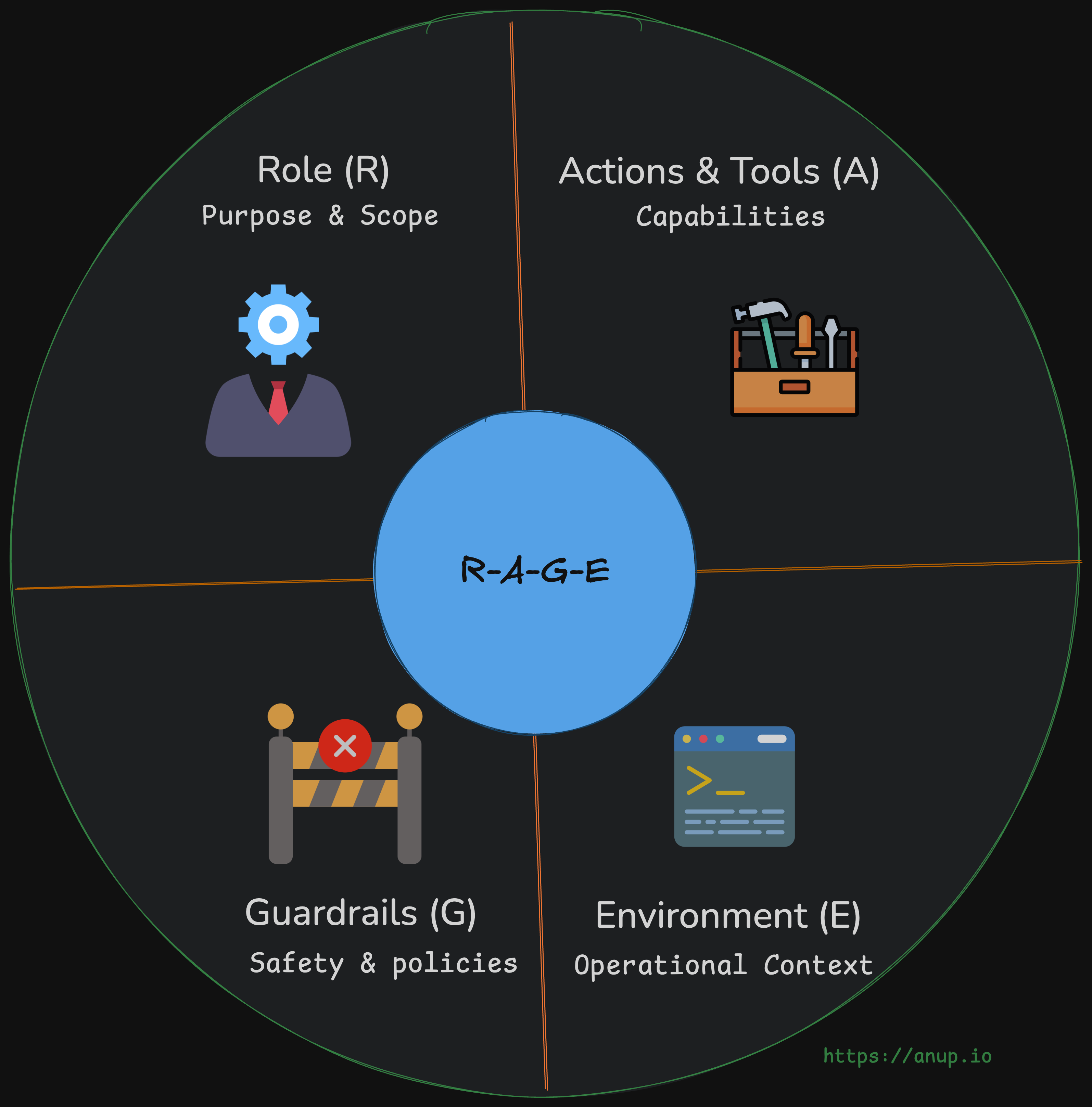 If you're designing an AI agent, define these four attributes: Role (R), Actions/Tools (A), Guardrails (G), and Environment (E)—R-A-G-E.