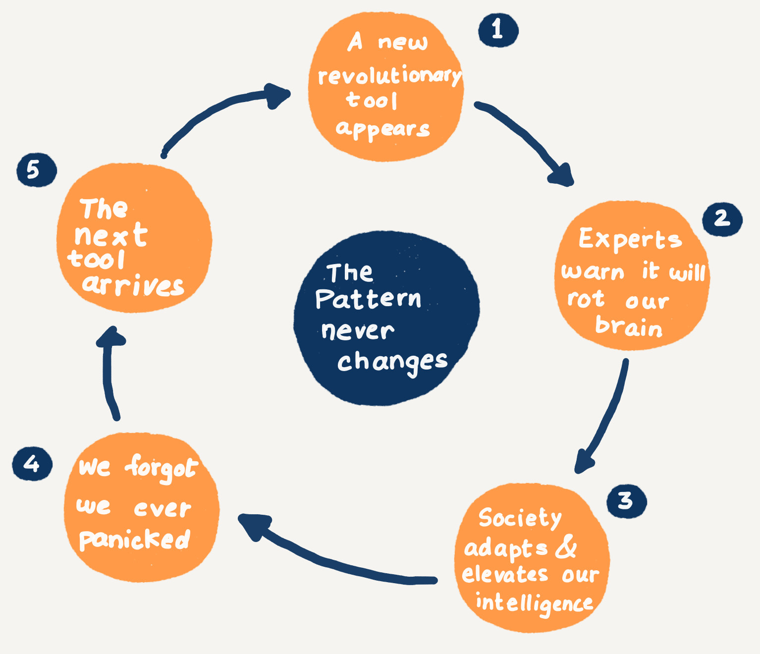 Today's panic follows the exact same script. Large Language Models will destroy our ability to think critically and create creatively. We'll outsource cognition entirely. Students will stop learning to write. Programmers will forget how to code. If ChatGPT can draft emails and Claude can explain quantum physics, why develop any skills ourselves?
