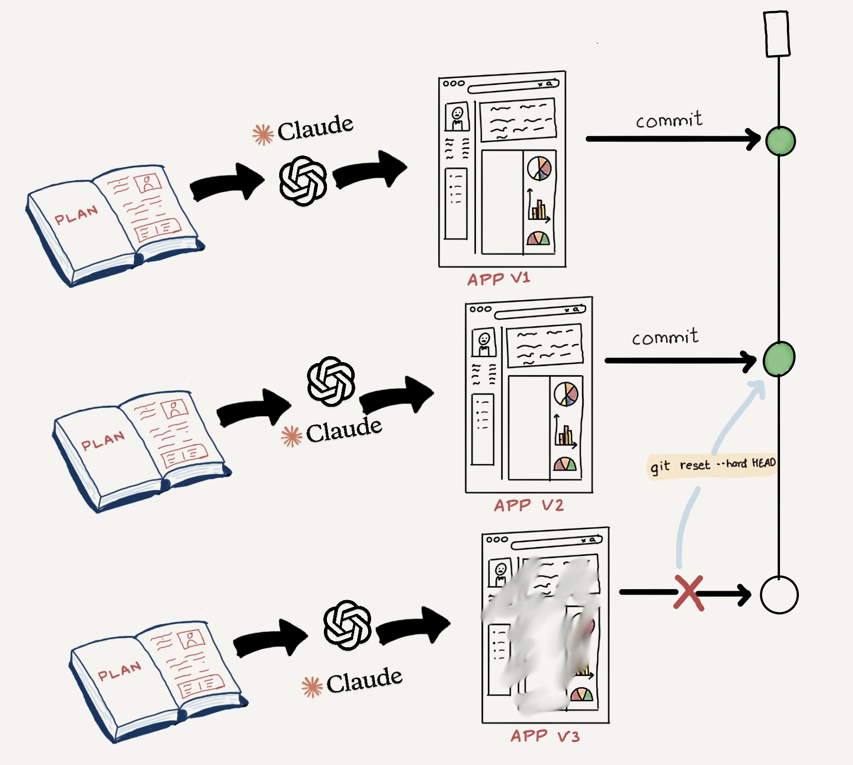 Use version control religiously, and commit everything that works. Then if you’re stuck in a loop with the LLM then git reset --hard HEAD is the escape hatch2. Every time the LLM guesses wrong three times in a row, nuke the branch and replay the single good attempt on a clean slate. You trade history for clarity, the right bargain when the code is clay rather than contract.